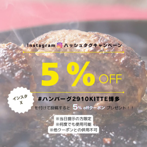 デミグラスソースをはじめ、オニオンジンジャーソース、トマトソース、クリームマスタードソースなど、定番からオリジナルまで種類豊富なソースで楽しめる2910のハンバーグ。 ライスとスープが付いたお得なランチセットは、平日限定でご提供中です。 *メニュー* ◆平日限定/ハンバーグランチ 1,540円(税込) (選べるソース・ライス・スープ付き) ※17時までのご提供 \SNSハッシュタグキャンペーン開催中/ InstagramやX(旧Twitter)で、ハンバーグ2910のアカウントをフォローして #ハンバーグ2910KITTE博多 付きの投稿をすると、5%オフクーポンをプレゼント! 詳しくは公式Instagram(@hanbagu2910)や店頭にてご確認ください。