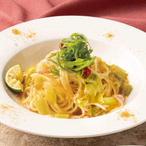 「紅ずわい蟹と焼き九条ねぎのカラスミペペロンチーノ」。