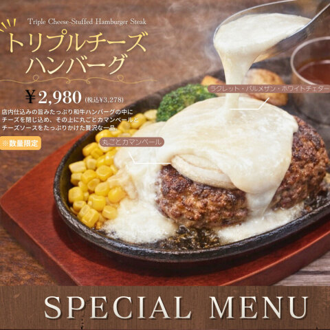 ハンバーグ2910のおすすめ、スペシャルメニューのご紹介。 ゴロゴロした食感を楽しめる、和牛のみで作った粗挽きのハンバーグ「和牛100%ハンバーグ」。 焼き石スタイルでアツアツのままご提供します。 和牛ハンバーグの中にチーズを閉じ込め、上に丸ごとカマンベールと数種類のチーズソースをたっぷりかけた贅沢な一品「トリプルチーズハンバーグ」は、毎日数量限定でご提供中です。 気になる方はお早めに! *メニュー* ◆和牛100%ハンバーグ 2,728円 ◆トリプルチーズハンバーグ 3,278円 ※全て税込 \SNSハッシュタグキャンペーン開催中/ InstagramやX(旧Twitter)でハンバーグ2910のアカウントをフォローして、#ハンバーグ2910KITTE博多 付きの投稿をすると、5%オフクーポンをプレゼント! 詳しくは公式Instagram(@hanbagu2910)や店頭にてご確認ください。